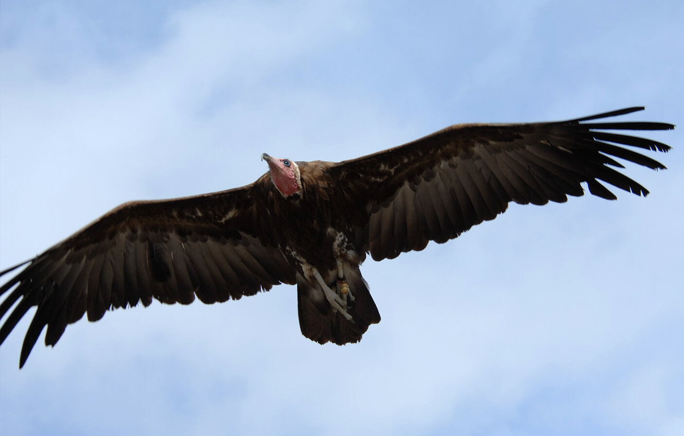 Hooded vultures are one of the smallest vulture species in the world and are also, unfortunately, at the bottom of the vulture hierarchy. Hooded vultures, with their long neck and beak, are specifically designed to stick their head into a carcass and strip away what is left on the inside. The shorter feathers on their head, or their ‘hood’ allow for any bacteria on their head to be cooked off by the sun.