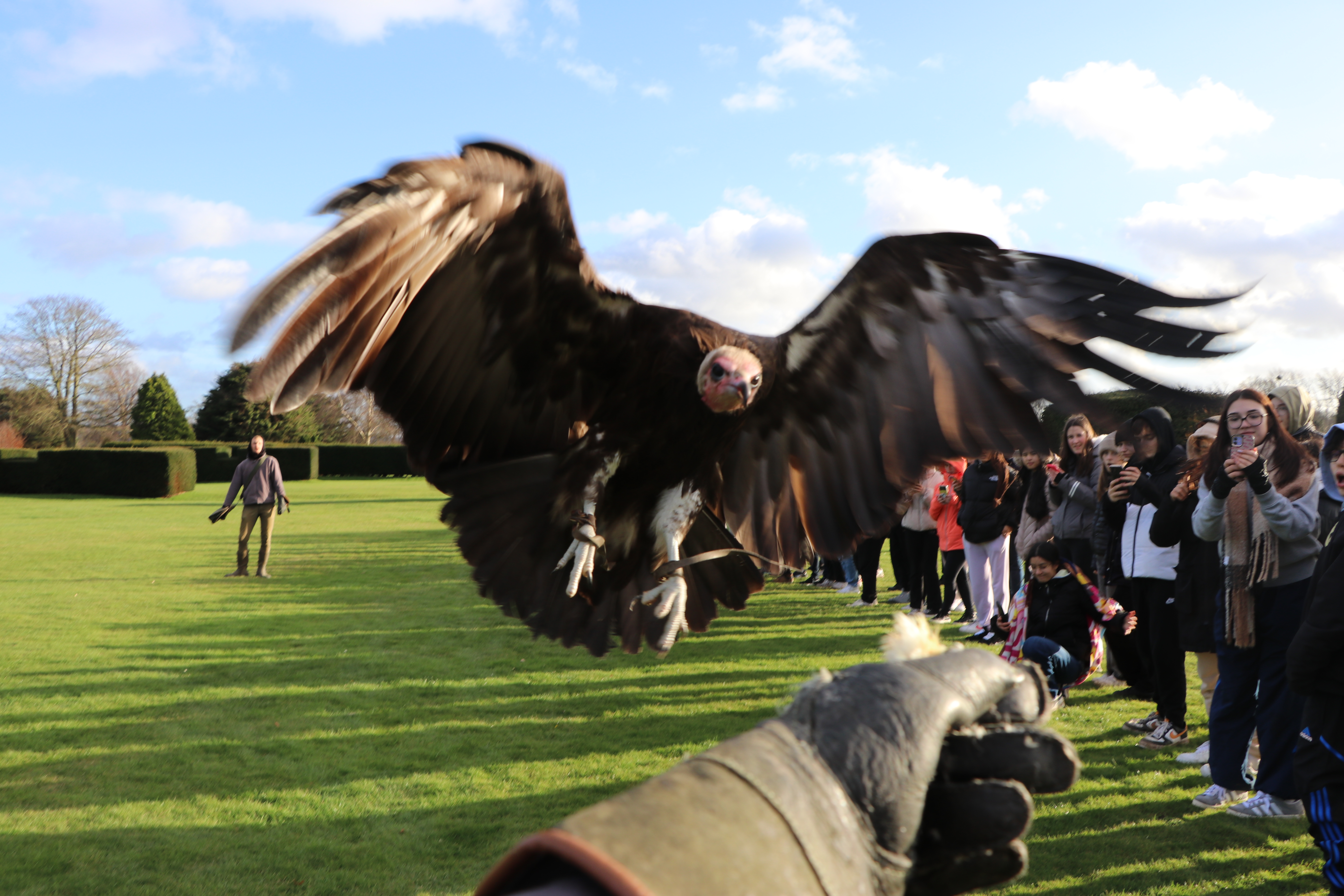 A fiesty girl at times, Maggie will occasionally chase her handlers and peck at their shoelaces if she believes they are taking too long inbetween flights. However, she is all about manners and if we ask nicely, she will let us give her head a light scratch! Maggie has also been known in the past to frequent the terrace of the manor house and pester the hotel guests for their scones as they try to enjoy their afternoon tea.